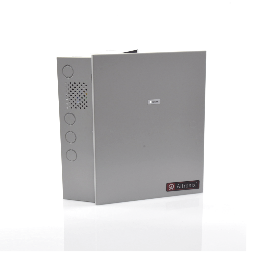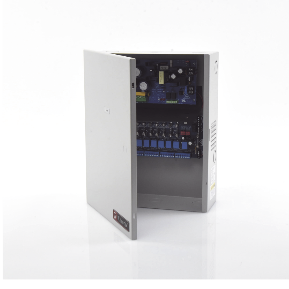 Fuente para aplicaciones en control de acceso, con capacidad de respaldo para 12 y 24 Vcc @ 4 A , con 8 circuitos de control ( NO ) y 8 circuitos de control trigger voltaje de entrada de : 115 Vca.
